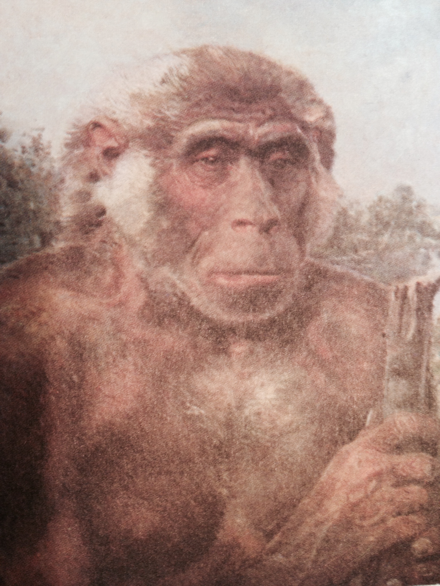 What amuses me about this artist’s rendering is that this primate relative is posed in a manner suggesting the Mona Lisa, staring at us in the foreground, with a line of lush trees creating depth of field behind. We can imagine that this would never have been the way that prehistoric people would have rendered themselves. It assumes an entire ideology of dominance over, and separateness from, nature, in its very composition.